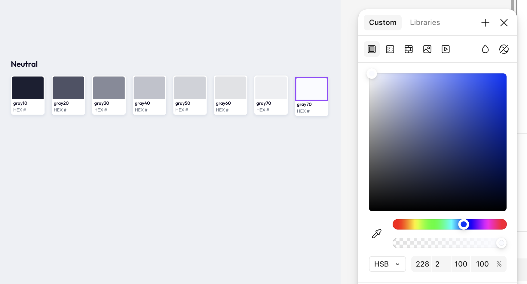 Use the real hue in the name (gray40, purple20). Avoid UI-role names like backgroundPrimary. Roles can change; colors rarely do.