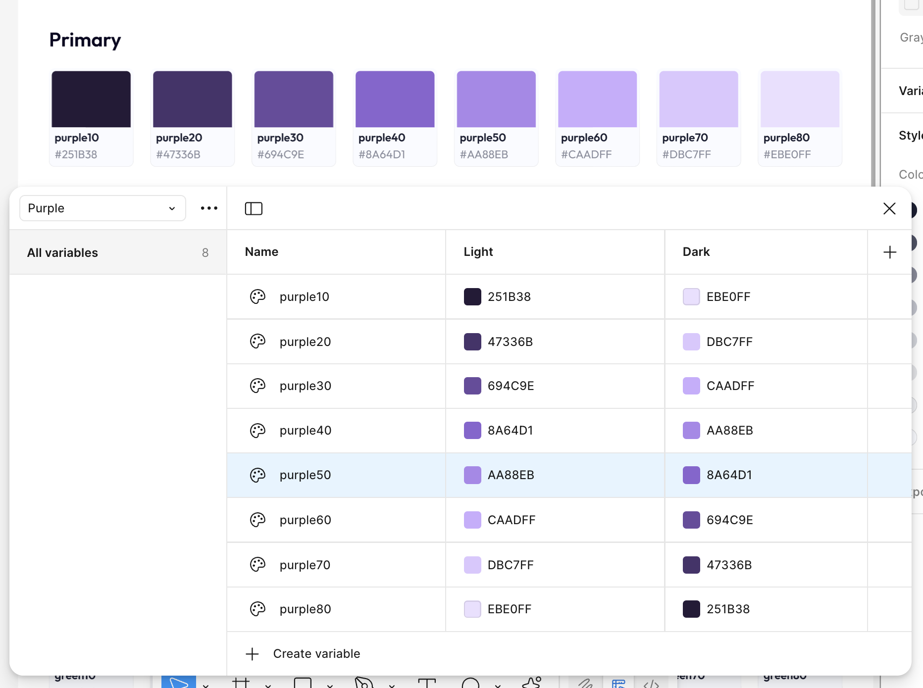 Add variable mode → rename to Light (Mode 1) and Dark (Mode 2).